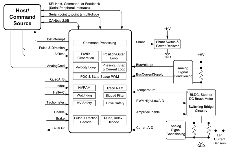 Juno IC는 과전류, 과전압/저전압, 과열 감지와 같은 고급 앰프 관리 기능을 갖추고 있습니다. 특수 외부 제어 루프는 압력, 유량 및 온도 제어를 포함한 광범위한 모터 관련 제어 애플리케이션을 허용합니다.